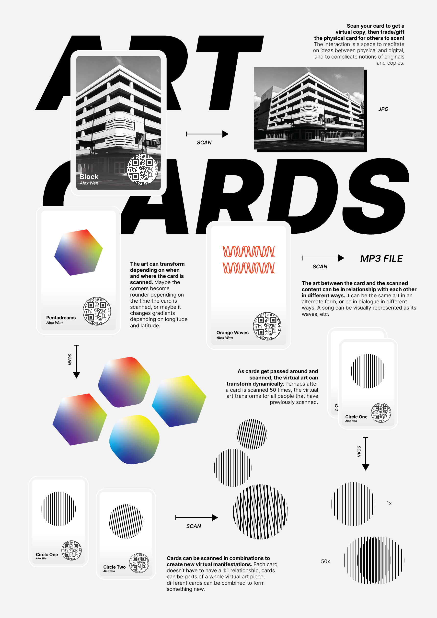 The initial idea was simple, have every artwork and art object represented as a card, it can be a photograph of a clay work, or an illustration made by an artist. Then, there would be a QR code or some sort of unique ID that would allow anyone with the card to scan it for a virtual version of the art, like a JPG of the photograph. The idea is to leverage the sentimentality of the physical, tangible object, while also leaning into the abundance that technology can offer. If someone with a card gives their friend a card, their friend can scan it and get a virtual version of the art too, even though there is only one physical card between the two of them. This allows different people to have different levels of relationship with the art and artist. Some people may hold on to the cards they like the most, basically having a pocketable art gallery, while others might share the card with as many people as possible, ensuring the art gets distributed like grass-root networks.